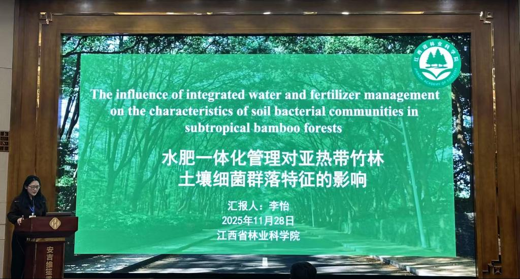会议邀请中国科学院华南植物园主任闫俊华研究员、中国林科院亚热带林业研究所周本智研究员分别以《野外台站控制实验》《弃管对毛竹林土壤碳储量和组分的影响》为题作专题报告,分享前沿研究成果与实践经验。国际竹藤中心、浙江科技大学、江西省林科院、浙江省林科院等单位科研人员围绕竹林生态领域热点问题进行学术报告交流。李怡代表团队作《水肥一体化管理对亚热带竹林土壤细菌群落特征的影响》学术报告,详细阐述了该研究在竹林土壤微生物调控、高效经营等方面的创新发现,为优化亚热带竹林水肥管理技术提供了重要理论依据与实践指导,展现了我院在竹林生态研究领域的专业实力。