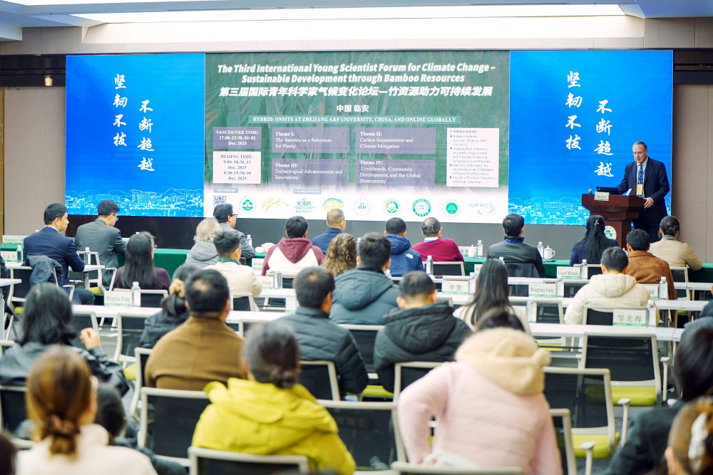 国际竹藤组织副总干事张东升、国际竹藤中心主任覃道春、浙江农林大学校长吴家胜、加拿大不列颠哥伦比亚大学林学院院长Rob Kozak 教授出席开幕式并致辞。来自国内外 43 家高校、科研机构和行业组织的二百余名专家学者和青年科研人员线下参会。开幕式由瑞典皇家科学院院士 John Innes 教授主持。论坛围绕竹资源在碳汇、替代材料、生物经济等方面的关键作用展开研讨。各国专家介绍了竹子作为高效碳汇和气候智慧型材料的重要贡献,并从“以竹代塑”“竹基材料工程化”“碳汇计量与模型构建”“乡村振兴与民生改善”等方面提出创新观点,为推动全球气候治理与竹产业发展提供新思路。