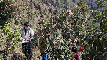 2日,在婺源永清农业开发公司负责人陪同下,工作组先行前往江湾镇红花油茶品种选育基地,开展红花油茶开花性状调查。江湾镇拥有2000多亩的红花油茶,时下正值花期,漫山红遍、千姿百态。工作组紧锣密鼓的采集了花性状数据,收集了花色特异样本,为观赏油用红花油茶新品种选育积累了基础数据。从基地返程,工作组紧接着与县委常委、江湾镇党委书记胡春明、江湾镇党委副书记、镇长江鹏翀、县科技局副局长胡建生进行了亲切座谈。温强就近期特派员工作计划及2021年中央1号文件乡村振兴相关内容与胡春明书记进行了交流,胡春明对工作组多年来的帮扶工作给予了肯定,期盼工作组能够籍乡村振兴之机,继续挖掘地方红花油茶品种资源,帮扶地方企业做大做强特色红花油茶产业;胡建生高度评价了科技特派员工作组长期扎根婺源地方林业,甘于奉献的精神,他指出工作组能吃苦能战斗,工作务实且卓有成效。