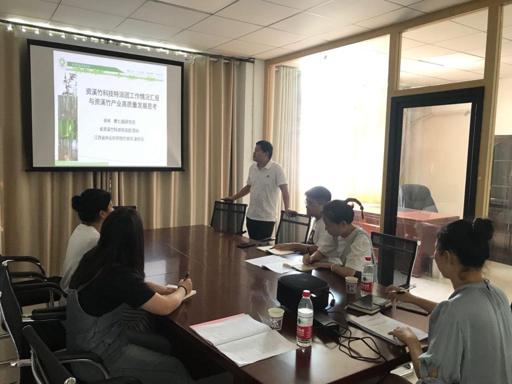 在资溪县科技创新中心组织的座谈会上,余林团长简要介绍了省资溪竹科技特派团近年来的工作成效,详细解读了江西省人民政府办公厅出台的《江西省人民政府办公厅关于加快推进竹产业高质量发展的意见》(赣府厅发〔2021〕18号)文件精神,并从资溪县毛竹资源和产业现状、毛竹林现代经营管理技术、资溪县竹产业发展的思考与建议等方面就资溪县竹产业高质量发展进行了深入交流探讨。