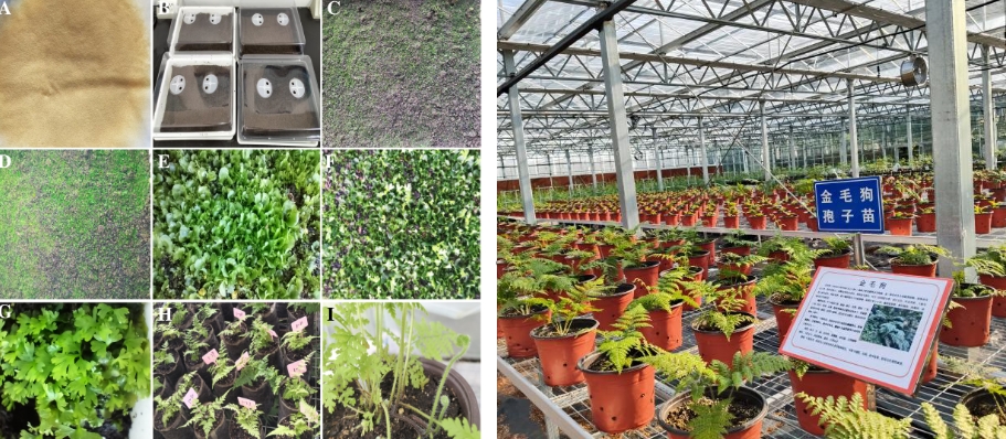 该成果采用金毛狗孢子,通过仿生技术播种,在孢子萌发率、配子体转化为孢子体、缩短幼苗周期等技术方面取得重要突破,极大地提高了金毛狗的繁殖系数和种苗质量,将金毛狗从孢子到可移栽幼苗的周期缩短至70-80天,移栽成活率提高至100%,为金毛狗批量化栽植提供了育苗保障,有效解决了野生采挖不合法问题。