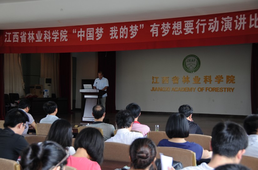 为深入学习党的十八大精神和习近平总书记关于中国梦的系列讲话精神,扎实推动中国梦主题宣传教育,2013年6月26日,由院党办、院工会、院团委共同主办的“ 江西省林业科学院‘中国梦 我的梦’有梦想要行动演讲比赛”在院综合楼四楼举行。院领导黄小春、林小凡、徐林初及院工会、党办、科研管理处、子弟学校负责人担任本次比赛的评委。黄小春院长做重要讲话,他深刻阐述了“中国梦”这一主题,同时强调,林科院所有干部职工每一个人都要有梦要行动,让“中国梦”激励全院干部职工勇往直前,努力奋斗,梦想成真。