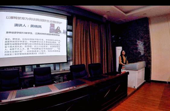 在报告中,黄晓凤首先从鄱阳湖候鸟保护的重要性和保护压力进行背景分析,再从雁鸭类水禽高效扩繁及健康养殖技术体系创建与应用和野生动物繁育在线辅助科研平台研究两方面介绍我院研究的经验与做法,最后提出以繁育促保护,野生动物繁育产业助力精准扶贫的观点,得到较大反响。