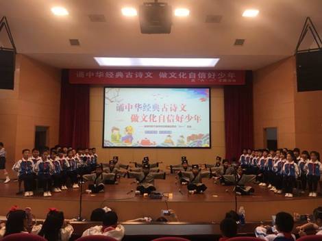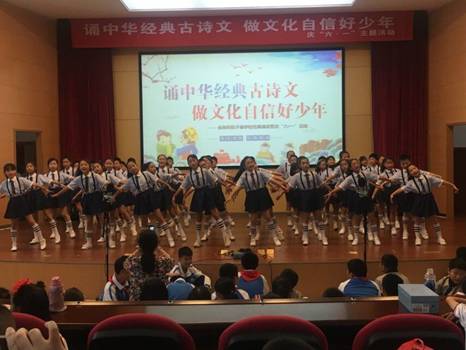《三字经》、《弟子规》、《千字文》、《敕勒歌》……中华经典古诗文用多种多样的形式呈现出来,或诵读节奏明朗、活泼灵动;或歌唱声情并茂、旋律高亢;或舞姿优美、飘逸曼妙,为中华传统文化注入了新的生命力。最后,大会在五年级的《宋词传唱》中走向高潮,《如梦令》、《明月几时有》《虞美人》 ……会场几百名观众的热情被瞬时点燃,他们激情飞扬,放声高歌,尽情抒发对中华民族优秀传统文化的热爱和作为中国人的骄傲和自豪。
