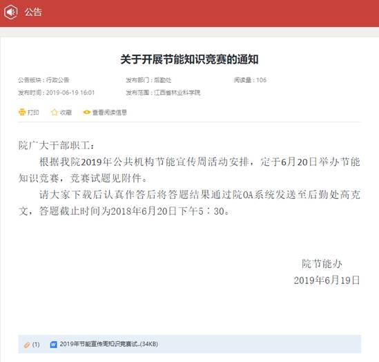 为深入贯彻落实习近平新时代中国特色社会主义思想和党的十九大精神,牢固树立创新、协调、绿色、开放、共享新发展理念,我院在2019年节能宣传周期间通过院OA系统举办了节能知识竞赛。