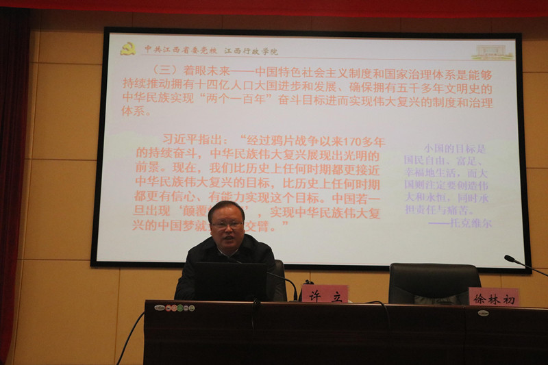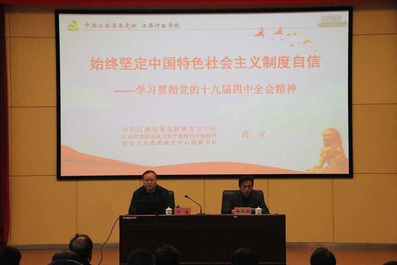 12月2日上午,我院在院创新大楼二楼阶梯会议厅举行党的十九届四中全会精神宣讲报告会。中共江西省委党校研究室主任、江西省党校系统习近平新时代中国特色社会主义思想研究中心副秘书长许立教授应邀作宣讲报告。院党委书记俞东波、党委副书记徐林初、副院长周诚同全院各单位、各部门负责同志及干部职工代表共150余人一起聆听了宣讲报告。
