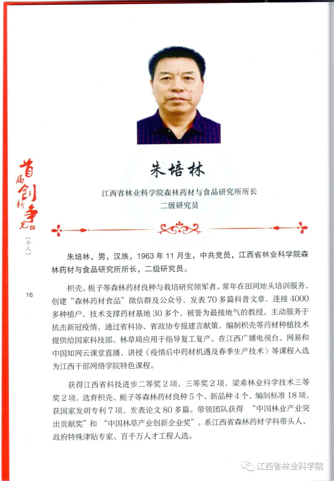 编者按:5月29日,省科协、省人社厅、省科技厅、省国资委四部门联合印发《关于表彰首届江西省创新争先奖获奖者的决定》,决定授予超级稻研究室等 5 个集体首届江西省创新争先奖(集体),授予王怀清等 35 名同志首届江西省创新争先奖(个人)。6月16日,省科协召开会议对首届江西省创新争先奖获奖者进行了表彰。其中,省林科院森林药材与食品研究所所长、二级研究员朱培林荣获首届江西省创新争先奖(个人)。这是继省林科院科研管理处处长、研究员龚春荣获2020年江西省“最美科技工作者”后,省林科院在2020年获得的又一殊荣。在此,特别推出《以中药材科技助力脱贫攻坚的实干家——记首届江西省创新争先奖获得者朱培林研究员》一文,希望全院广大科技工作者以朱培林、龚春为榜样,学习他们勇攀高峰、敢为人先的创新精神,学习他们奋勇争先、不甘落后的进取精神,学习他们团结协作、淡泊名利的团队精神,为建设国家生态文明试验区、打造美丽中国“江西样板”提供强大科技支撑。