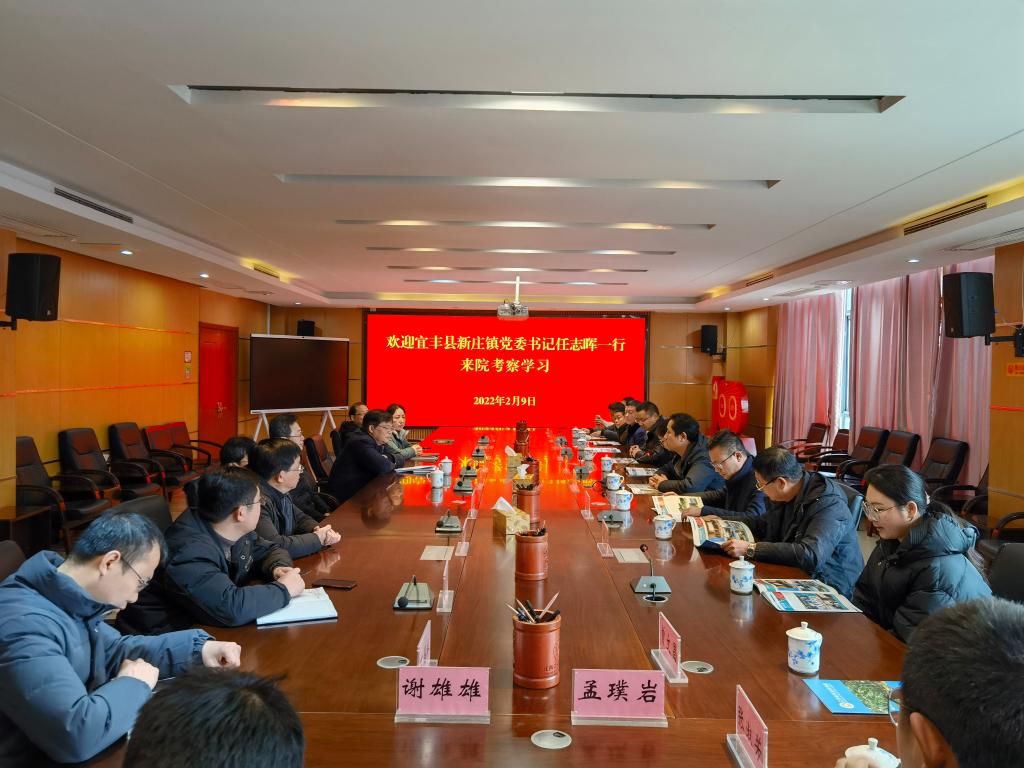 2月9日,宜丰县新庄镇党委书记任志晖、镇长罗鹏率该镇党政领导班子和张家村两委班子成员来我院考察学习,并就推进张家村乡村振兴工作进行交流座谈。院党委书记俞东波、院长杨杰芳、副院长高璜、总工程师龚春热情接待了任志晖一行。