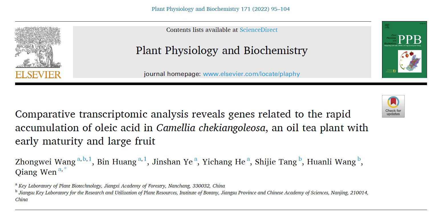 1月1日,团队联合中科院江苏植物研究所,在国际知名期刊《植物生理生化》(Plant Physiology and Biochemistry,中科院2区,影响因子4.27)发表论文“红花油茶比较转录组分析挖掘油酸快速积累的关键基因”(Comparative transcriptomic analysis reveals genes related to the rapid accumulation of oleic acid in Camellia chekiangoleosa, an oil tea plant with early maturity and large fruit),论文成果获得了国内首个高质量红花油茶种仁全长转录本,通过与前期脂肪酸组分测定数据联合分析,获得并初步验证了与红花油茶种仁中油酸快速积累相关的关键基因。