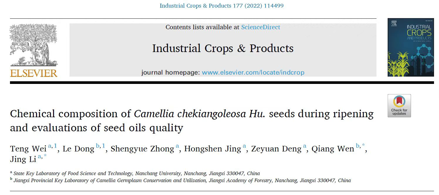 1月10日,团队联合南昌大学食品科学国家重点实验室“天泽园”团队,在国际著名期刊《工业作物与产品》(Industrial Crops & Products,中科院1区,影响因子5.645)发表论文“红花油茶籽仁形成过程中化学成分与油品质评价”(Chemical composition of Camellia chekiangoleosa Hu. seeds during ripening and evaluations of seed oils quality),论文成果构建了改进的优劣解举例(TOPSIS)法红花油茶营养评价体系,揭示了红花油茶籽仁发育过程中营养化学成分变化规律,筛选出两个高营养的优良无性系,揭示红花油茶果实成熟后的最佳采收时期。