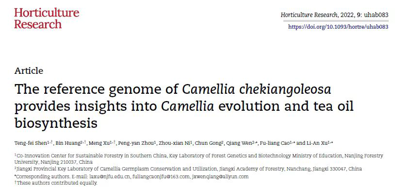 1月24日,团队联合南京林业大学曹福亮院士创新团队,在国际顶级期刊《园艺研究》(Horticulture research,国际园艺类期刊排名第一,中科院1区,影响因子6.793)发表论文“红花油茶参考基因组及山茶物种进化与茶油生物合成新见解”(The reference genome of Camellia chekiangoleosa provides insights into Camellia evolution and tea oil biosynthesis),论文成果在全球范围首次破译了红花油茶遗传密码,是目前全球质量最高的染色体级别油茶基因组,期刊编审认为本论文成果具有跨时代的里程碑意义,本论文的发表为提升我省油茶育种研究在全国乃至国际影响力奠定了重要的基础。