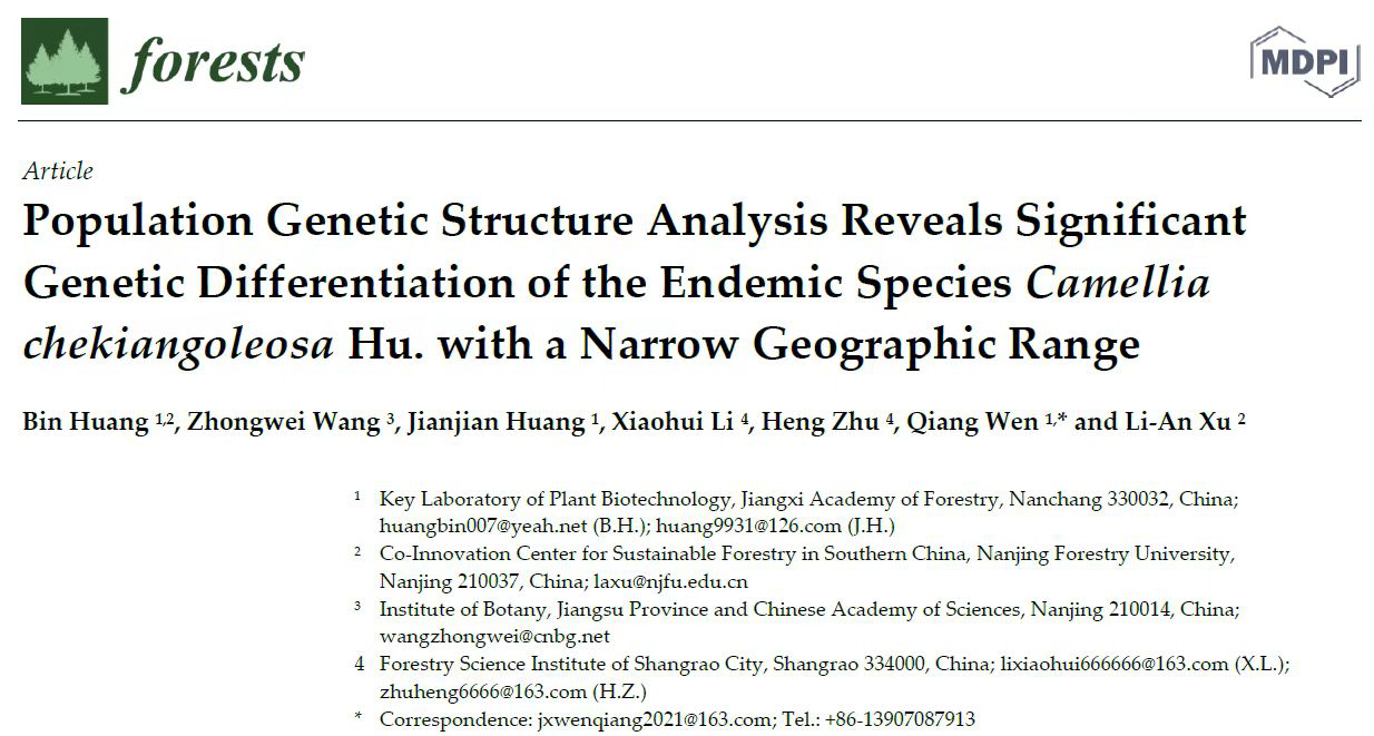 2月3日,团队联合南京林业大学,在国际权威期刊《森林》(Forests,中科院林业学科2区,影响因子2.633)发表论文“遗传结构分析揭示狭域种红花油茶群体显著遗传分化”(Population Genetic Structure Analysis Reveals Significant Genetic Differentiation of the Endemic Species Camellia chekiangoleosa Hu. with a Narrow Geographic Range),论文利用16个多态性丰富的SSR标记研究了红花油茶的群体遗传多样性,揭示红花油茶群体间、内不同层次的遗传变异,显示该物种显著遗传分化,研究为红花油茶资源保护与利用奠定了重要的遗传学基础。