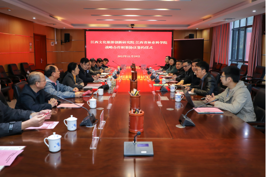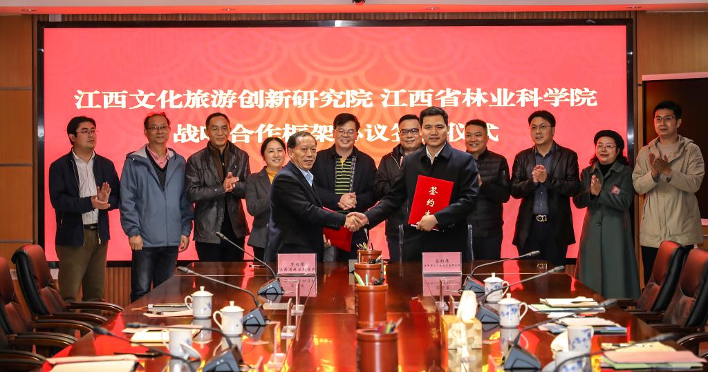 11月29日,江西省林业科学院与江西文化旅游创新研究院在省林科院举行战略合作框架协议签约仪式。省林科院院长杨杰芳、省旅游集团副总经理熊锋出席签约仪式并致辞;省林科院副院长周诚、龚春,江西文旅创新研究院负责人晋帅兵、省旅游集团研学教育科技公司总经理李黎明出席签约仪式。签约仪式由龚春主持,周诚和晋帅兵分别代表江西省林业科学院和江西文化旅游创新研究院签署战略合作框架协议。