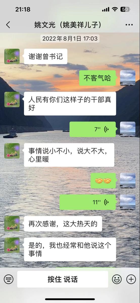 79岁的姚美祥是原来的建档立卡贫困户,年老多病,儿子常年在外务工,他独自一人生活。驻村工作队通过日常走访了解到姚美祥家里的实际情况后,曾文昌就把保障老人的基本生活作为第一要务,只要在村里都会去他家拉拉家常,搭手搞搞卫生,帮助采购生活用品。日常像亲人一样的帮扶,让姚文光万分感动,他紧紧攥着曾文昌的手说:“感谢你们这一年对我爸爸的关心和帮助,我常年在外,多亏了你们的照顾!要不是你们,我爸病了都没法去医院,家里臭了都没办法搞干净!”