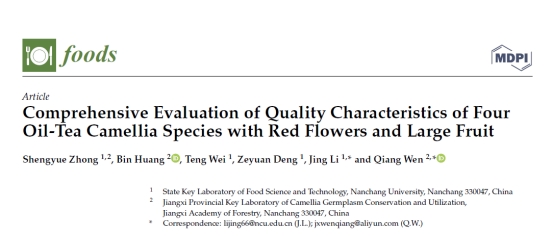 近日,省林科院油茶等经济林创新团队与南昌大学食品科学国家重点实验室合作开展的红花油茶经济性状综合评价分析研究成果“Comprehensive Evaluation of Quality Characteristics of Four Oil-Tea Camellia Species with Red Flowers and Large Fruit”发表在国际知名期刊《foods》(中科院分区二区,IF=5.561)。
