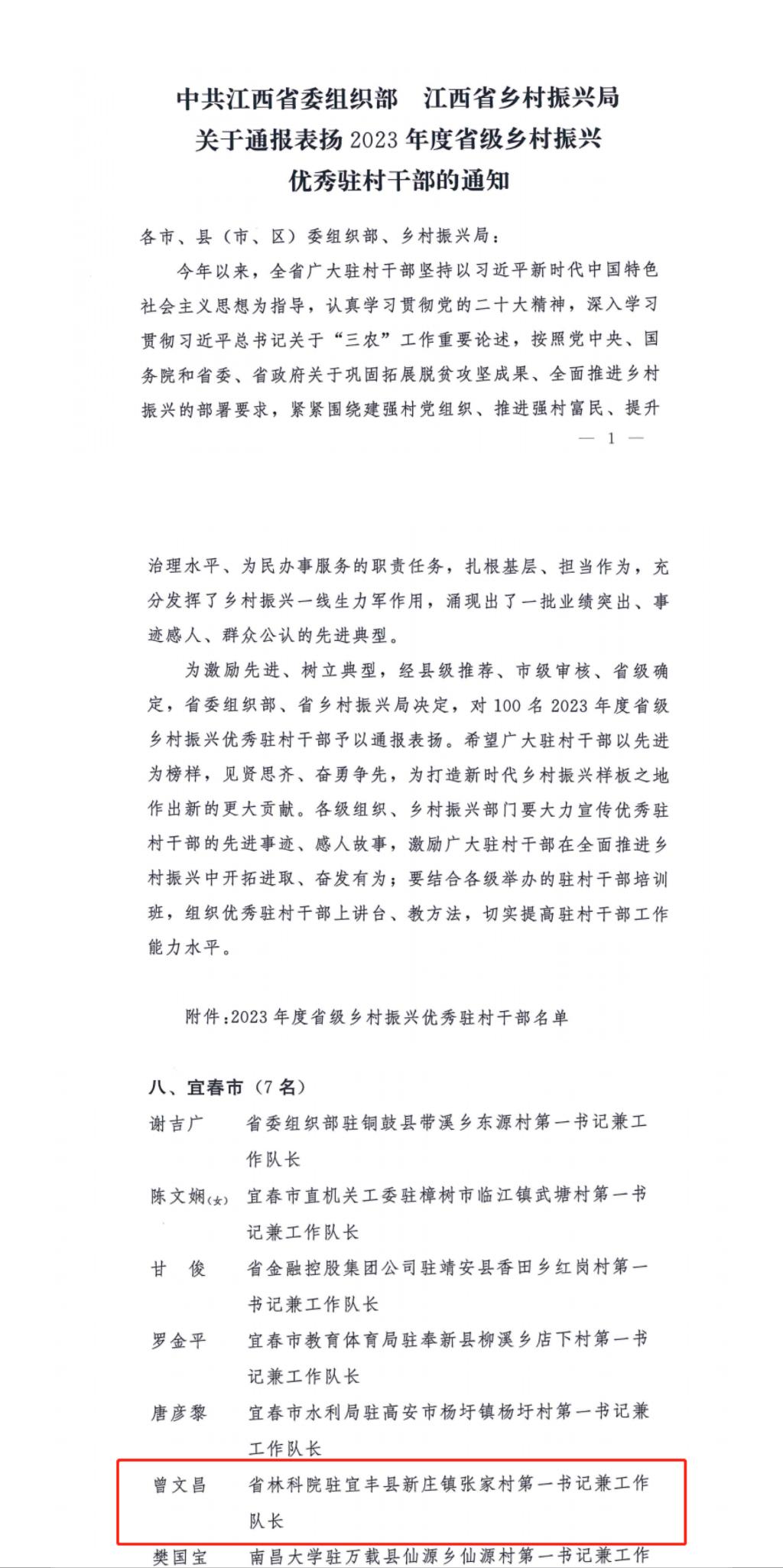 近日,江西省委组织部、江西省乡村振兴局通报表扬2023年度省级乡村振兴优秀驻村干部,省林科院派驻张家村原第一书记兼工作队长曾文昌获评“江西省2023年度省级乡村振兴优秀驻村干部”。