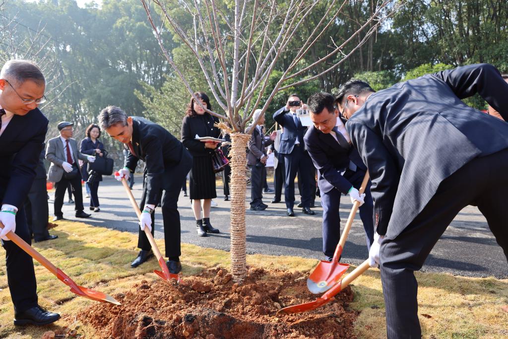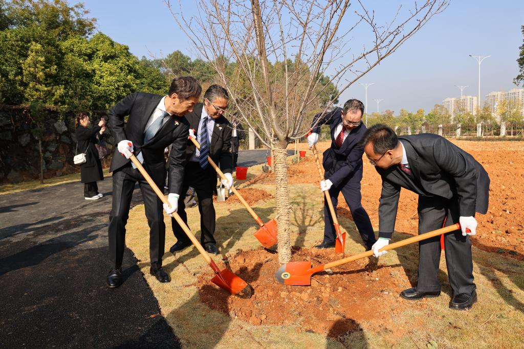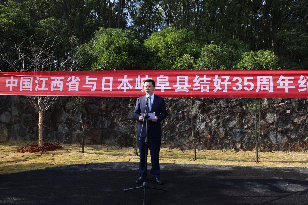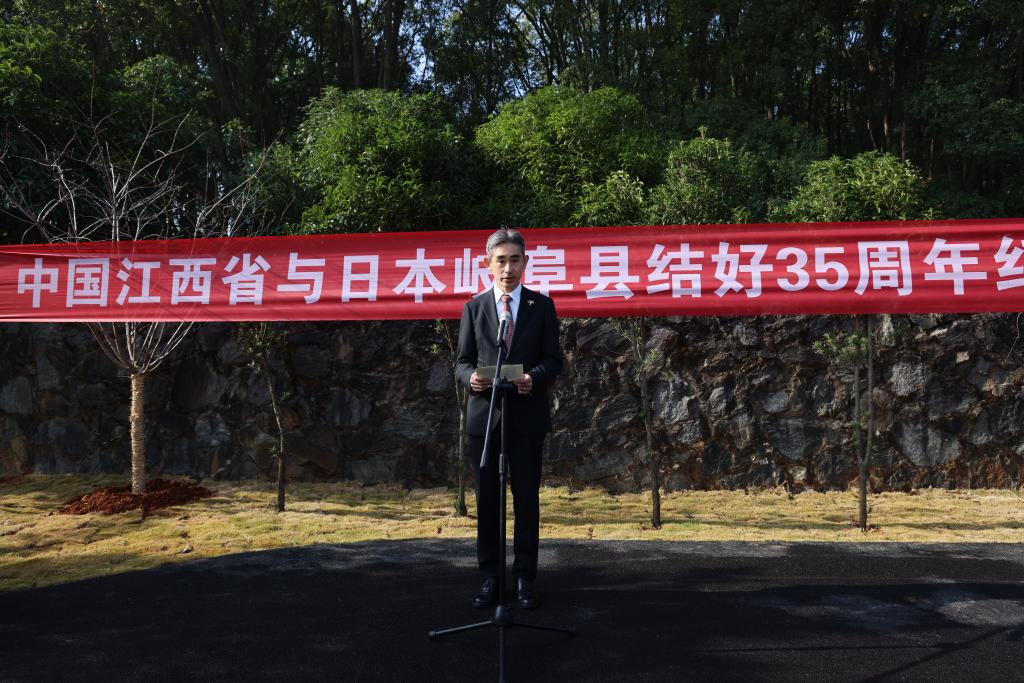 大森康宏指出,自双方签订友好合作协议以来,今年迎来了第35个年头。在此期间,双方在农业、林业、环境、旅游等各个领域开展交流,友谊越来越深厚。由于新冠疫情在全球蔓延,两省县之间互访一度无法成行,今天能够重启,感到十分高兴。从林业领域来看,在前期的活动交流过程中,我们营造了“中日友谊林”和“青少年林”,实施了“井冈山生态示范林营造项目”。他表示,希望扩大技术合作、人才培养等交流活动,推动双方取得更大的发展。同时,期待今天栽种的樱花、樟树与以往纪念植树仪式上栽种的树木一道,作为友谊的象征,在两省县人民的爱护下茁壮成长。