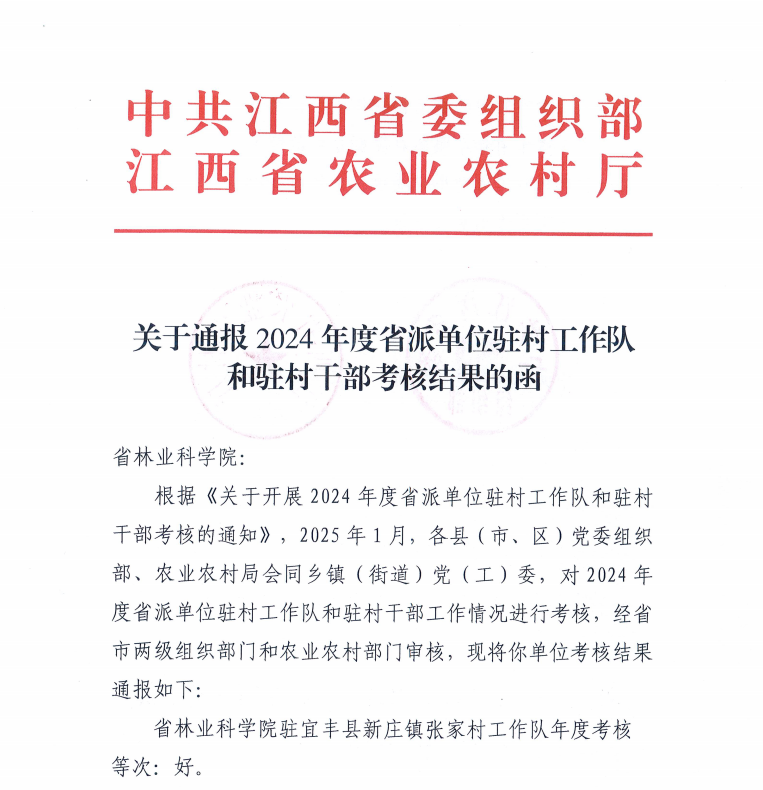 近日,省委组织部、省农业农村厅联合发文,通报2024年度省派单位乡村振兴工作考核结果:省林科院驻村工作队2024年度考核等次为“好”。我院乡村振兴驻村帮扶工作已经连续四年考核结果评定为“好”。这是对我院乡村振兴帮扶工作的高度肯定,也是对全体驻村干部今后工作的鼓励。