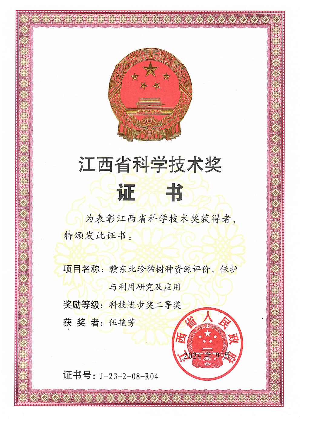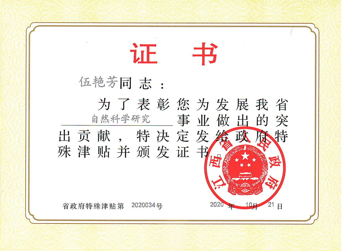 她是省政府特殊津贴专家、江西省百千万人才工程人选,获得省委组织部“百人远航工程”资助,获“江西省巾帼建功标兵”荣誉、“省直机关优秀共产党员”、“最美林业科技推广员”等称号。