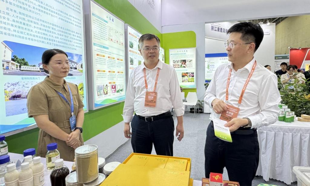 省发改委副主任余世华等领导莅临省林科院展位参观,驻足详细了解山香圆产品、樟树精油及籽油产品、金毛狗人工驯化繁育技术等重点推介科技成果、产品,杨杰芳与科技人员逐一介绍了各项科技成果的技术特点、行业优势与产业化前景。