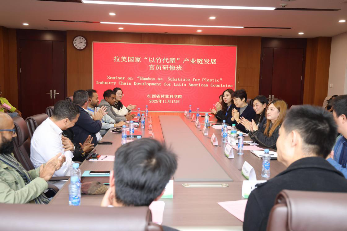 11月13日,由国家林业和草原局国际林业科技培训中心(国家林业和草原局竹子研究开发中心)承办的商务部2025年援外培训项目“拉美国家‘以竹代塑’产业链发展官员研修班”现场教学活动在江西省林业科学院举行。国家林业和草原局竹子研究开发中心国际处处长郑友苗、江西省林科院副院长黄慧出席,来自哥斯达黎加、苏里南、古巴、哥伦比亚、多米尼加、斯里兰卡6个国家的27名学员参加。