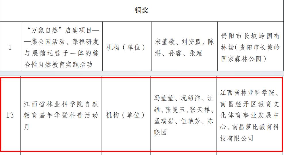 近日,从中国林学会传来喜讯,在“绿水青山就是金山银山”理念提出20周年之际举办的首届自然教育创新大赛中,由江西省林业科学院精心打造的《自然教育嘉年华暨科普活动月》系列活动,凭借创新的活动设计、深厚的科研底蕴与广泛的社会影响,首次成功斩获全国自然教育创新活动赛道铜奖,为赣鄱大地自然教育事业再添光彩。
