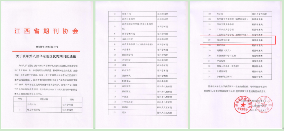 近年来,《南方林业科学》期刊始终坚持党管期刊原则,坚持正确的政治导向和学术引领,把意识形态工作摆在最重要的位置,坚守学术诚信和科研伦理底线,严把期刊出版质量关。此次入选华东地区优秀期刊和江西省优秀期刊,是对《南方林业科学》期刊质量和学术水平的权威认可和充分肯定。《南方林业科学》编辑部将以此为契机,以习近平新时代中国特色社会主义思想为指导,围绕林草行业“十五五”规划新要求,密切追踪林草行业研究热点,进一步提升期刊学术质量和影响力水平,推动《南方林业科学》期刊高质量发展。