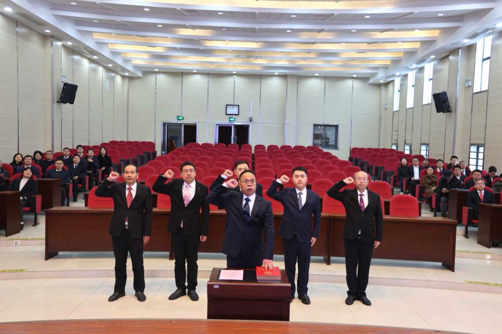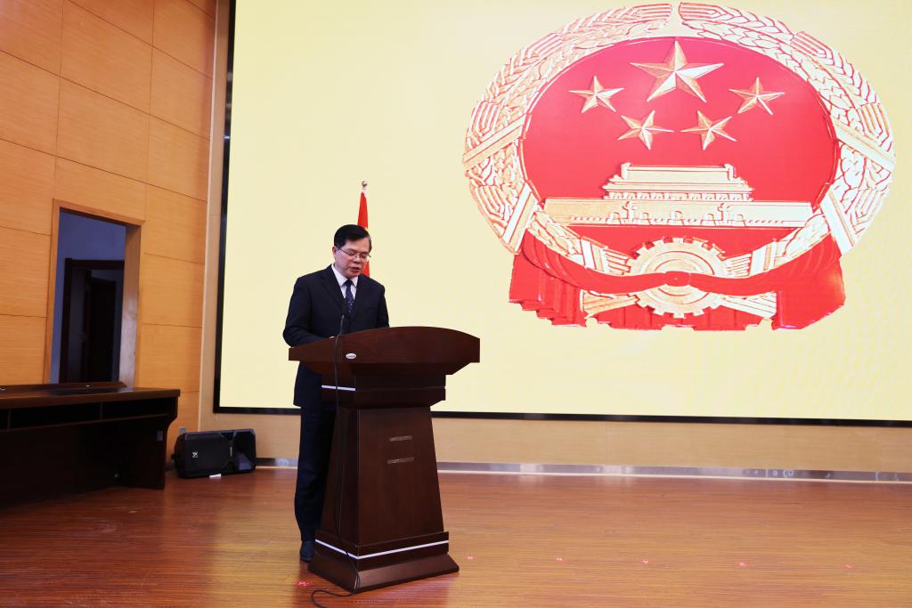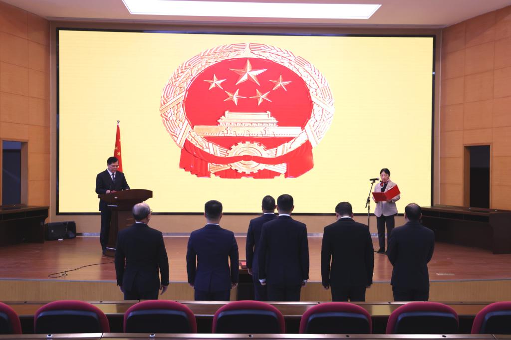 宣誓仪式上,全体人员面向国旗党徽肃立,唱中华人民共和国国歌。随后,领誓人手抚宪法、领诵誓词,其他宣誓人列队肃立、跟诵誓词。誓言铿锵、掷地有声,充分展现了弘扬宪法精神、维护宪法权威、履行宪法使命的坚定信念与坚定决心。