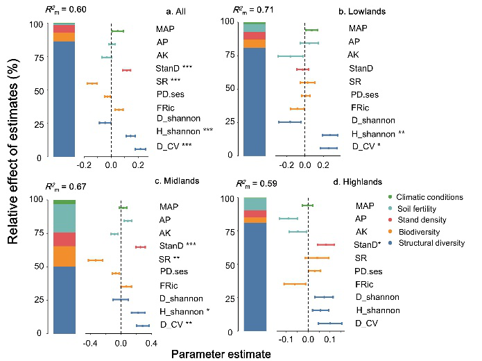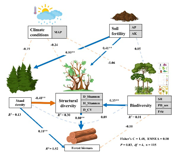 研究综合运用层次分割与结构方程模型,解析了结构多样性、生物多样性(物种、系统发育、功能)、林分密度、土壤及气候因子对森林生物量的复杂影响网络。结果表明,在所有海拔梯度上,结构多样性对生物量的直接正向贡献最为强烈且稳定。相比之下,物种多样性、系统发育与功能多样性以及土壤肥力,均主要通过提升结构多样性来间接促进生物量积累;而林分密度则通过抑制结构多样性间接降低生物量。这清晰揭示了结构多样性在生态系统中的核心中介角色,解释了为何在复杂的自然森林中,生物多样性与生物量的直接关系常常表现不稳定。