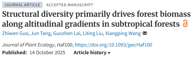 近日,省林科院“珍贵树种与森林提质增效科技创新团队”联合北京林业大学,在国际生态学知名期刊《Journal of Plant Ecology》发表题为“Structural diversity drives forest biomass along altitudinal gradients in subtropical forests”的研究论文。该研究基于115个亚热带森林样地(含279个树种、7000余株树木)的翔实数据,首次系统阐明:树木的大小、高度差异(即结构多样性)是决定森林碳储量沿海拔梯度变化的首要且稳定的驱动因素,其核心作用显著强于并独立于传统关注的物种多样性及环境因子。此项成果是团队长期深耕“林分结构优化与森林功能提升”方向的一重要理论突破,为亚热带森林的提质增效提供了关键科学依据。