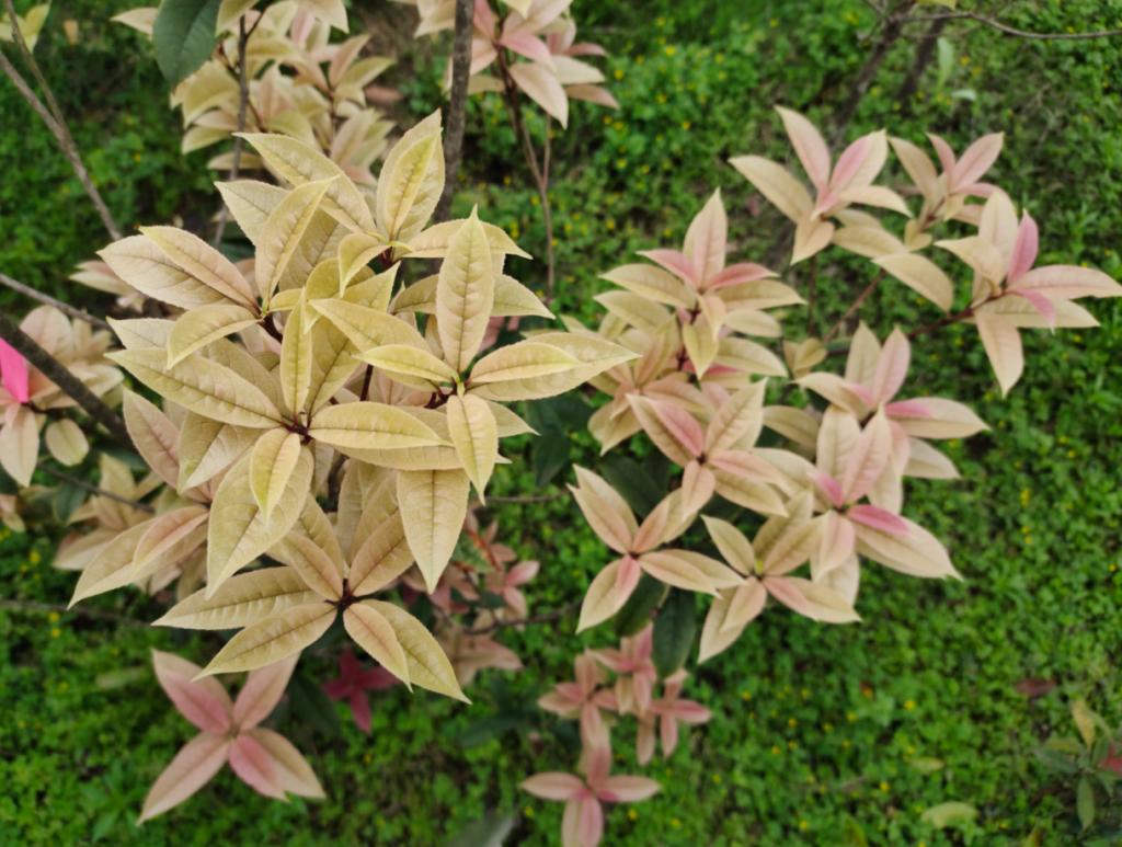 该品种源于“永福紫绚”芽变,其幼叶至成熟叶呈现 紫红→浅紫→粉红→粉白→黄白→深绿的连续色彩变化,尤其在叶片黄白阶段叶脉仍保持紫色,观赏性突出。叶缘上部2/3具锯齿,与对照品种形成明显区别。新品种权号的获得,标志着该品种正式进入知识产权保护与推广新阶段。