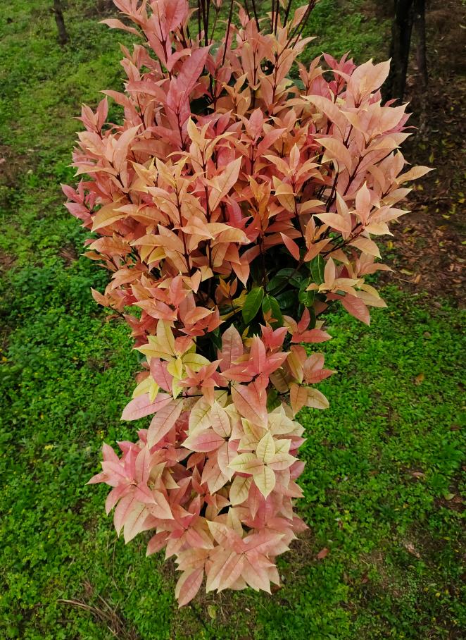 选自广西桂林桂花实生后代,历经近二十年系统选育。树型直立,分枝夹角小,树型紧凑,可培育为柱形景观树。叶色动态变化显著:幼叶红色,依次渐变为橘红、灰橘、黄绿,成熟叶绿色,全年具观赏价值,尤适用于园林造型与空间营造。