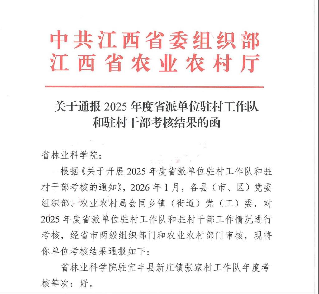 2月12日,省委组织部、省农业农村厅联合印发《关于通报2025年度省派单位驻村工作队和驻村干部考核结果的函》,通报我院2025年度驻村工作队和驻村干部考核结果:省林科院驻村工作队2025年度考核等次为“好”,1名驻村工作队员考核等次为“优秀”。院驻村工作队自2021年7月入驻宜丰县新庄镇张家村以来,已连续5年在年度考核中荣获“好”评,这是对我院乡村振兴定点帮扶工作的高度肯定。