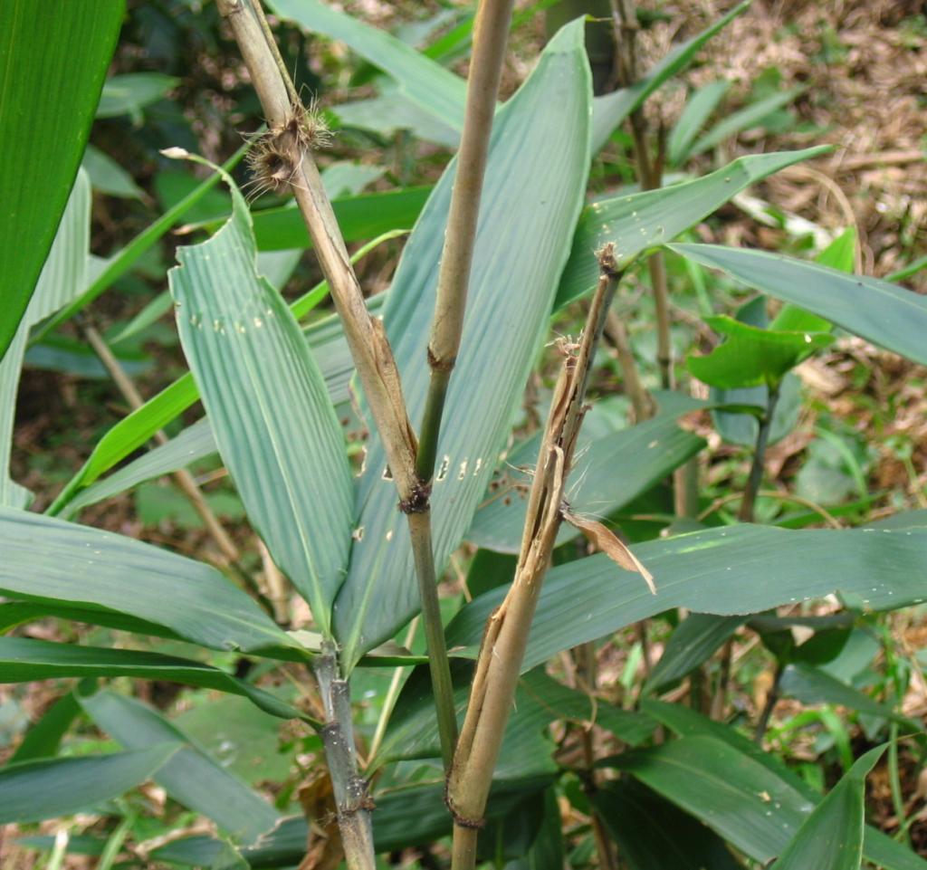 竿高约1.5m,直径5~10mm;节间长25~35(45)cm,幼时密被棕色贴生瘤基色刺毛,实心或近实心;竿环隆起。箨鞘短于节间,背面密被淡棕色瘤基长刺毛;箨耳镰形,长达2cm,边缘密生2行䍁毛,其毛长达3cm;箨舌高0.5~1mm,边缘密生长达2cm的流苏状䍁毛;箨片外翻或外展,椭圆状披针形。小枝具叶5~8,叶鞘密被瘤基长刺毛或老时无毛;叶耳极发达,边缘具长达3cm的放射状瘤基䍁毛;叶舌边缘具长达2.5cm的长䍁毛;叶片长15~35(40)cm,宽5~9(12)cm,下面沿叶脉被短粗毛,次脉8~12对,小横脉组成稀疏长方形。