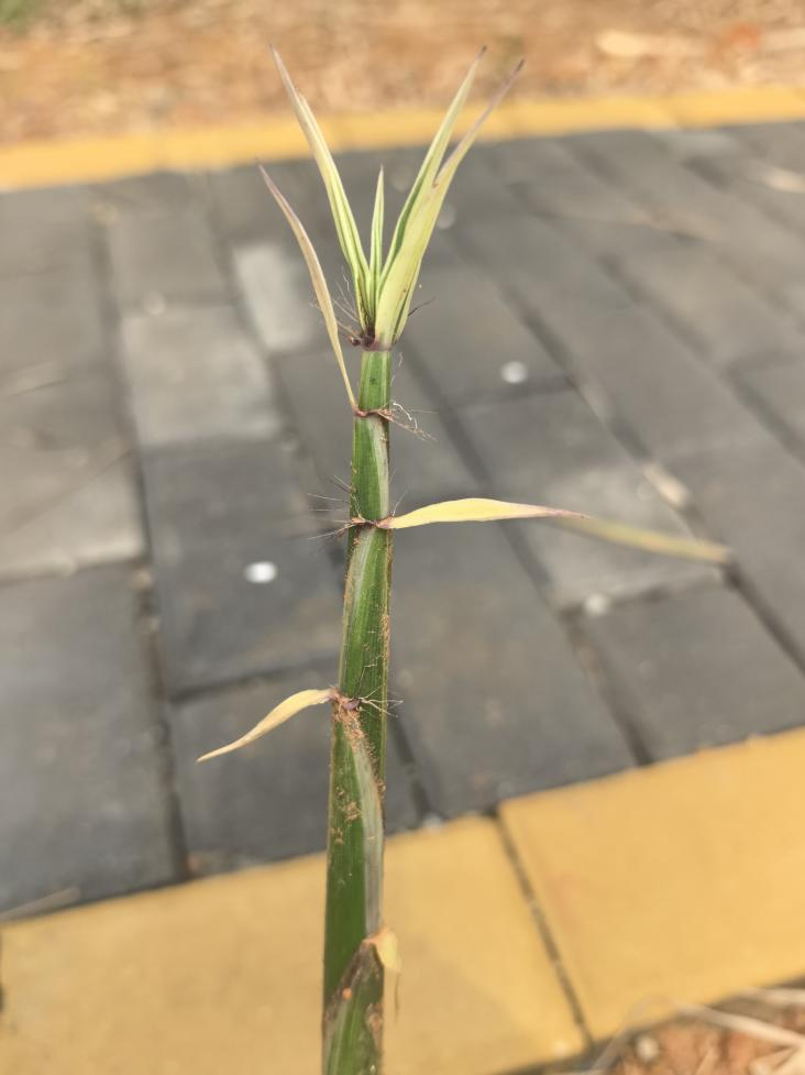 叶片绿色,具黄白色纵条纹;箨鞘新鲜时绿色,具黄白色纵条纹,箨鞘两边的条纹更宽大。