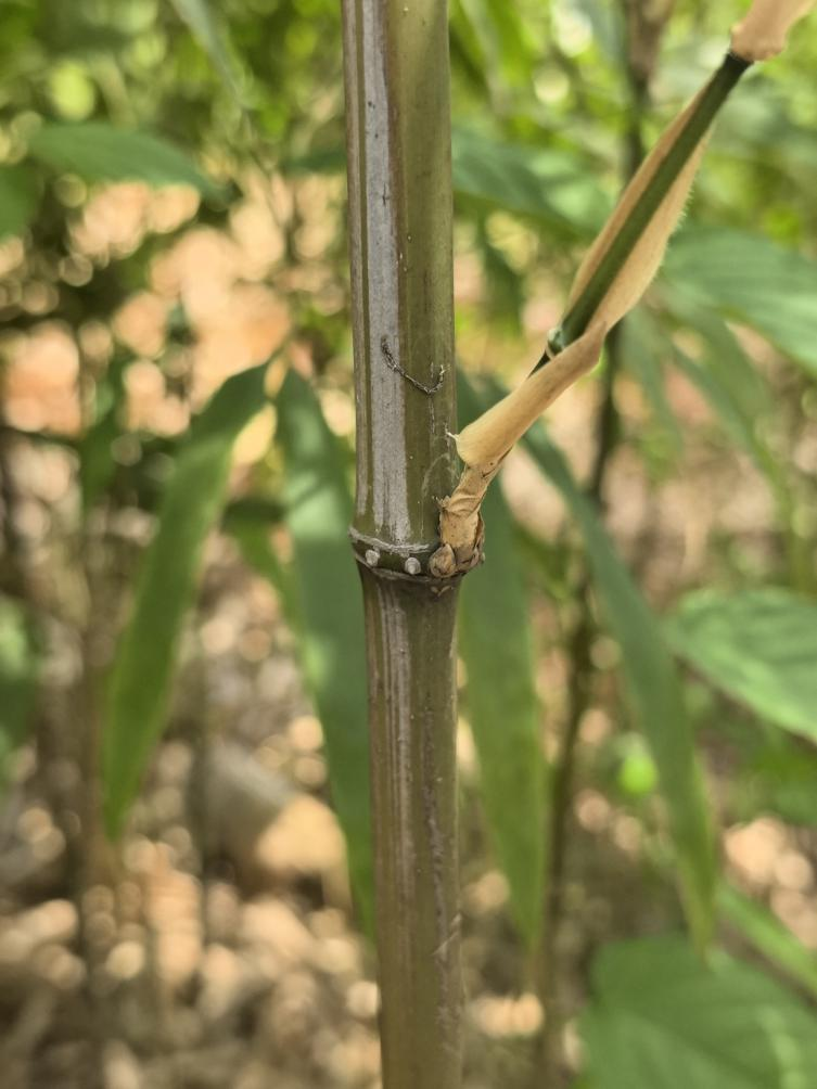 竿直立,高3~8m,粗1~4cm,节间长8~22cm,呈钝圆的四棱形,幼时密被向下的黄褐色小刺毛,毛落后仍留有疣基,故甚粗糙,竿中部以下各节环列短而下弯的刺状气生根;竿环位于竿分枝各节甚为隆起,不分枝的各节则较平坦;箨环初时有一圈金褐色绒毛环及小刺毛,以后渐变为无毛。箨鞘纸质或厚纸质,早落性,短于其节间,背面无毛或有时在中上部贴生极稀疏的小刺毛,鞘缘生纤毛,纵肋清晰,小横脉紫色,呈极明显方格状;箨耳及箨舌均不发达;箨片极小,锥形,长3~5mm,基部与箨鞘相连处无关节。末级小枝具2~5叶;叶鞘革质,光滑无毛,具纵肋,在背部上方近于具脊,外缘生纤毛;鞘口䍁毛直立,平滑,易落;叶舌低矮,截形,边缘生细纤毛,背面生有小刺毛;叶片薄纸质,长椭圆状披针形,长8~29cm,宽1~2.7cm,先端渐尖,基部收缩为一长1.8mm的叶柄,叶片上表面无毛,下表面初被柔毛,后变为无毛,次脉4~7对,再次脉为5~7条。笋期10~12月。