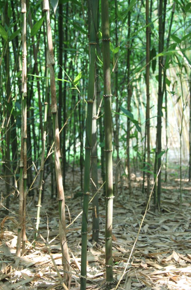 竿高4~8m,径1.5~5cm,共有30~35节,中部以下各节均环生有发达的刺状气生根,竿中部的节间一般长18(25)cm,绿色,或有些幼竿为紫色,且在节间基部具淡紫色纵条纹,表面光滑无毛,圆筒形或在竿基部略呈四方形,竿壁厚3~5mm,有时实心;箨环隆起,初时密被黄棕色小刺毛,以后变为无毛;竿环微隆起;节内长1.5~2.5mm;分枝习性较高,通常始于第11节;箨鞘薄纸质至纸质,宿存或脱落,在竿基部者长于其节间,呈长三角形,先端渐尖,背面紫褐色而夹有灰白色小斑块或圆形斑,疏被棕色或黄棕色小刺毛,鞘基的毛密集或环状,小横脉明显,中上部边缘具颇为发达的黄色纤毛;箨耳缺;箨舌膜质,拱形,高约0.8mm,边缘为生纤毛;箨片微小,长仅1~3mm,基部与鞘顶相连处几无关节。末级小枝具2~4叶;叶鞘无毛,纵肋明显,长3.5~4.5cm;鞘口两肩具灰白色而易落之䍁毛数条,毛长13mm,叶耳无;叶舌截形,高约0.5mm;叶片纸质,狭披针形,长5~19cm,宽0.5~2cm,先端长渐尖,基部楔形,上表面绿色,下表面淡绿色,无毛或在基部具灰黄色柔毛,次脉4~6对;叶柄长1~3mm。笋期10~12月。