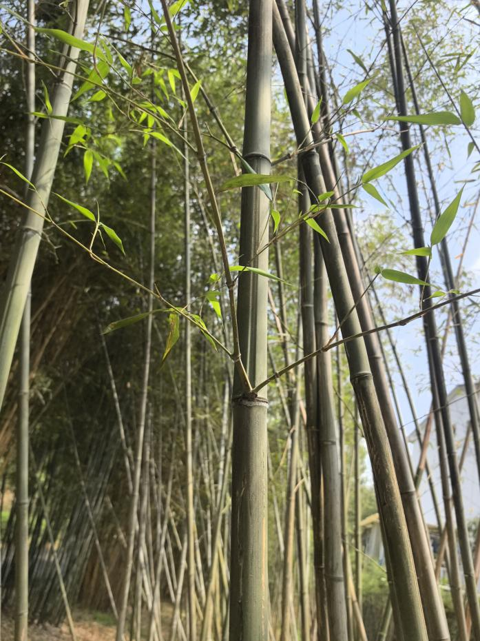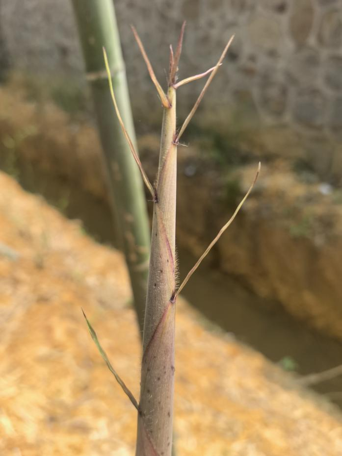 竿高7~14m,胸径粗6.3cm左右,幼竿绿色,老竿灰绿色,下部节间长12cm,中部节长25cm,壁厚0.5cm。竿环略低于箨环,稍平;箨环下方具明显的白粉圈,节间微被白色短柔毛。箨鞘背面黄褐色,略带紫色,具稀疏的棕褐色小斑点和浅紫色脉纹,密被浅棕色短硬毛,边缘密生浅棕色易脱落性长纤毛,基部微被白粉;箨耳卵状不明显,具稀疏的紫褐色扭曲长䍁毛;箨舌拱形,紫褐色,边缘密生长0.5~1cm纤毛,深紫色。箨片绿色,先端淡紫色,微皱曲,三角形至长三角形,外翻。末级小枝具3~4叶,无叶耳,叶舌明显伸出,具易脱落长纤毛,叶片深绿色,披针形,长4~13cm,宽0.5~1.5cm,背面中脉基部具柔毛,边缘锯齿。笋期4月。