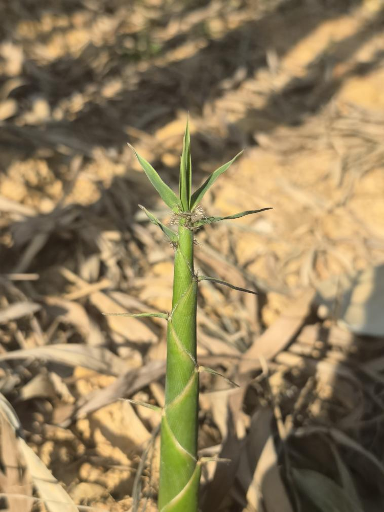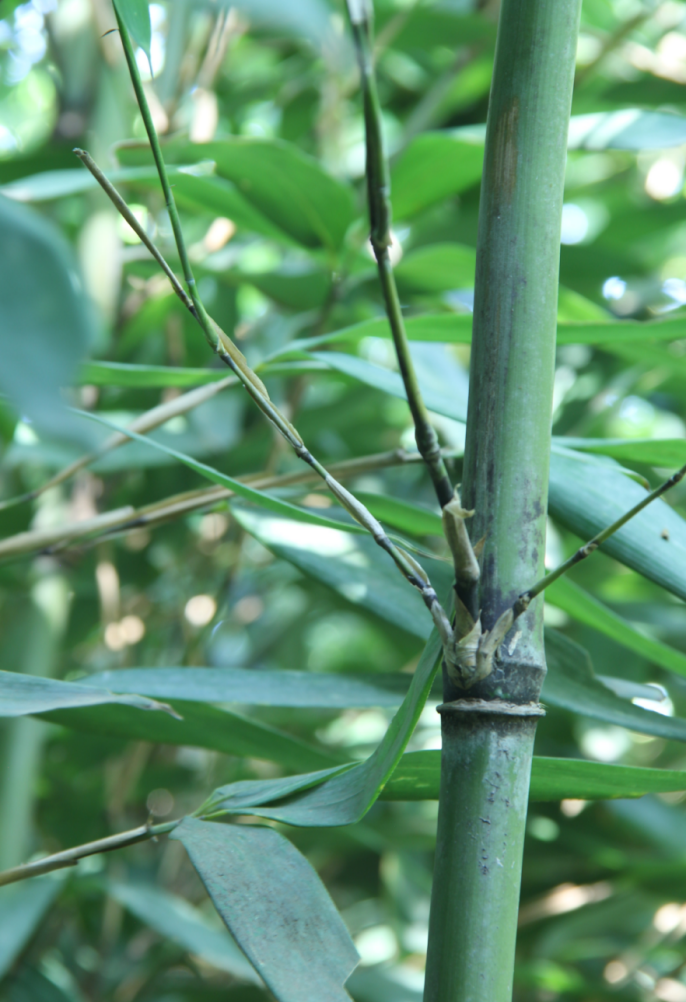 竿直立,高4~5m,粗1.5~2cm,嫩竿绿黄色,密布细纵肋,有小粗毛,二年生竹竿被少量煤状粉质,竿壁厚,几呈实心;节间最长达33cm,一般长24cm,圆筒形,在分枝一侧基部微凹;节处被厚黑色粉质;竿环和箨环均隆起;箨环具厚木栓质环状物;竿每节分5~7枝,居中的分枝较粗,与主竿呈50°~60°夹角,二级分枝通常为每节3枝。箨鞘淡绿色,背部与边缘被稀疏脱落性白色细刺毛或纤毛,并微被白粉,基部与边缘被稀疏脱落性短绒毛;箨耳镰形,有淡棕色较发达的䍁毛;箨舌截形,黄绿色;箨片线状披针形,常外翻而下挂。末级小枝具2或3叶;叶鞘无毛;无叶耳,鞘口无䍁毛或偶有1~3条直立䍁毛,其长约为5mm;叶舌拱形;下表面具细毛,尤以在基部和近主脉及次脉处较为明显,叶缘一边锯齿明显,另一边具极稀疏小锯齿以至平滑无齿,次脉5~7对,小横脉明显。笋期6约。