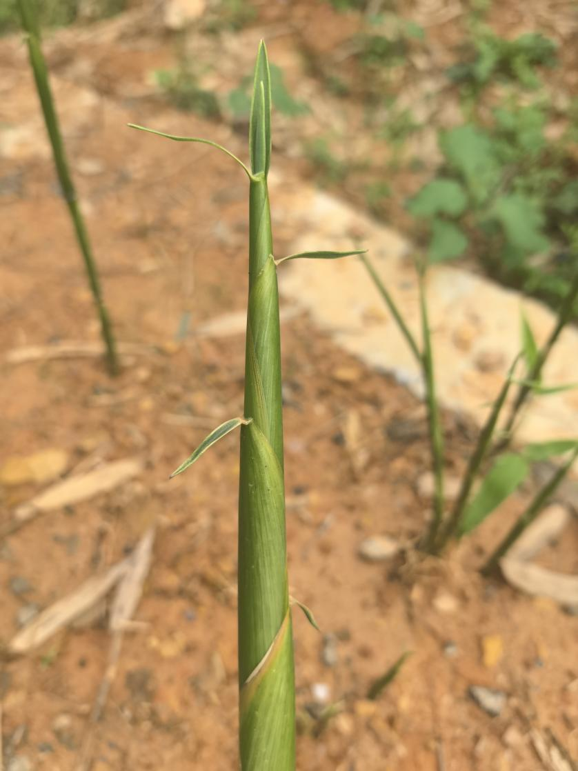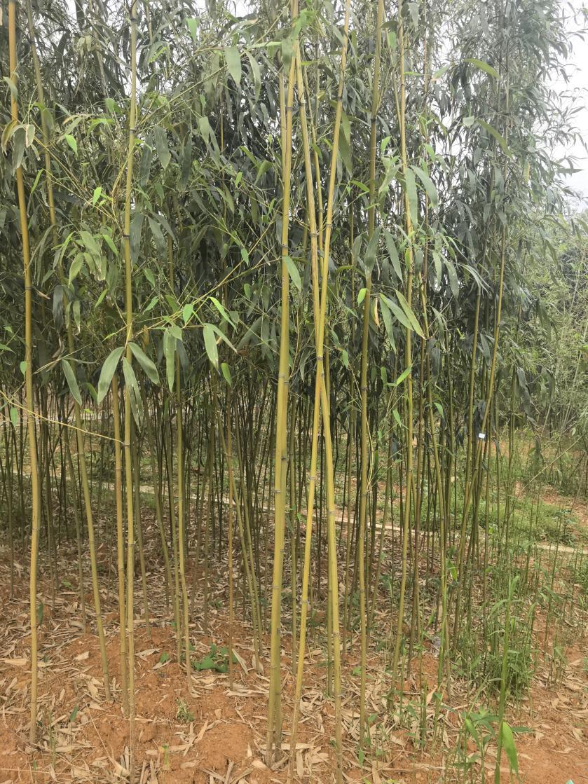 竿高5~12m,直立,径2~6cm,幼竿深绿色,无毛,被白粉,尤以在下方更为显著,老竿无毛,有纵肋;节间在分枝一侧扁平而有沟槽,节间长30~40cm,最长可达80cm;箨环木栓质隆起,起初具紫褐色刚毛;竿环亦隆起,于箨环近同高;节内略凹下。箨鞘早落性,革质,近长方形,先端钝圆,背面初为淡红棕色,并被薄白粉和贴生棕褐色刺毛,尤以基部最密,边缘具淡黄色而基部紫红色纤毛;竿基部者箨耳微弱,竿中部者箨耳伸出,呈卵状至椭圆状,竿先端者箨耳通常呈镰刀状弯曲,棕褐色表面粗糙而被绒毛,边缘具长达2cm波曲䍁毛,箨舌高4mm,呈拱形,边缘具稀疏锯齿,先端渐尖,基略向内收窄而后外延,脱落性;竿中部每节通常分3枝,主枝稍粗,基部略呈四方形,与竿有较大角度的开展,有时每节有多达5~7枝,其节环甚为隆起,高度近于箨环的一倍,但末级分枝之二环则同高,具3~6(9)叶;叶鞘长3.5~4.5cm,表面无毛,边缘具纤毛;叶耳不明显,偶有呈卵状而开展者;鞘口䍁毛波曲长达15mm,略呈放射状,脱落性;叶舌短,先端截形或近圆形,高1~1.5mm;叶片呈披针形或狭披针形,长6~22cm,宽1~3、5cm,先端渐尖,具锐尖头,基部钝圆形或楔形,下表面略带灰白色并具细柔毛,次脉4~8对,小横脉存在,呈宽的长方形,边缘多具锯齿;叶柄长2~6mm。笋期4~5月。