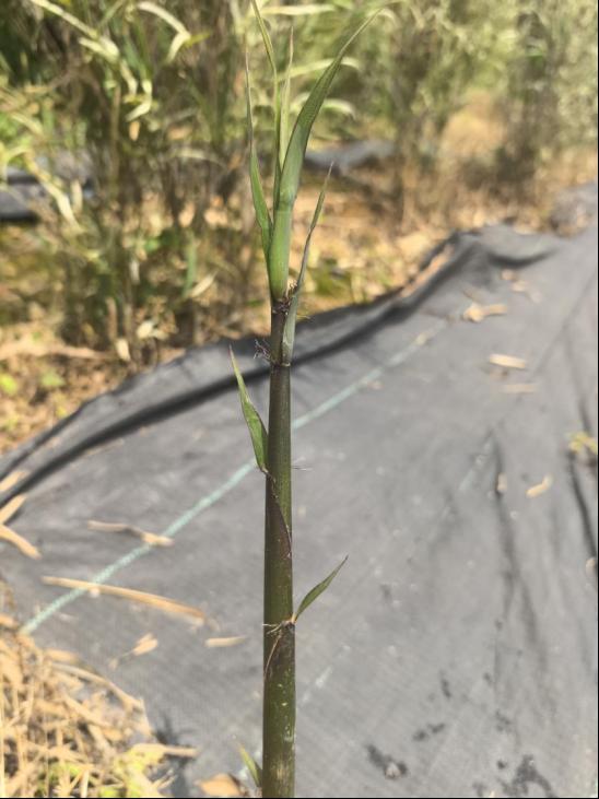 竿高3.5m,粗1.6cm,最长节间为27.5cm,幼竿被厚白粉,老竿具黑色粉垢;竿环略高于箨环;节内长4mm;箨环具箨鞘基部木栓质残留物,幼时远具绒毛。竿每节分3枝,枝近于直立,基部贴竿。箨鞘牛皮纸质或薄革质,草黄色,上部带紫色被白粉,疏生褐色小斑点,散生极稀疏贴伏刺毛,箨鞘下部的中间刺毛较明显,易脱落而留有痕迹,基部具一圈明显的淡黄色绒毛,并在中间混生有刺毛,边缘具易落的纤毛;箨耳小,半圆形,密被细绒毛,耳缘有数条粗硬䍁毛,有时无箨耳;箨舌拱形,高约2mm,背部具极稀疏的绒毛,或秃净无毛,边缘不规则,具短纤毛;箨片线状披针形,外翻,两面被稀疏绒毛,基部尤为密,先端渐尖。小枝具2或3叶;叶鞘无毛,边缘具短纤毛;无叶耳和䍁毛,叶舌截形,高约3.5mm;叶片椭圆状披针形,长10~20cm,宽1.5~2.4cm,上表面无毛,下表面短绒毛,先端短渐尖,基部钝圆形或楔形,幼叶的一边缘具较短刺状稀齿,另一边缘具极短的稀齿,老叶几为平滑。笋期6月上旬。