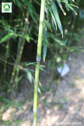 亚灌木状竹类。秆高2-3m,直立,直径0.5-1cm,秆壁甚厚或近于实心,新秆紫绿色至暗墨绿色,具少量白粉,老秆暗绿色;节间一般长20-22cm,光滑无毛,圆筒形,在有分枝一侧的基部微凹,秆自第5-7节开始分枝,各节3枝乃至多达9枝以上,枝直立或上举,与主秆作10°-30°。箨鞘宿存或迟落,薄纸质,淡暗绿色,先端略带淡紫色,光滑无毛,具白粉。笋期5月中旬至6月中旬。原产日本。