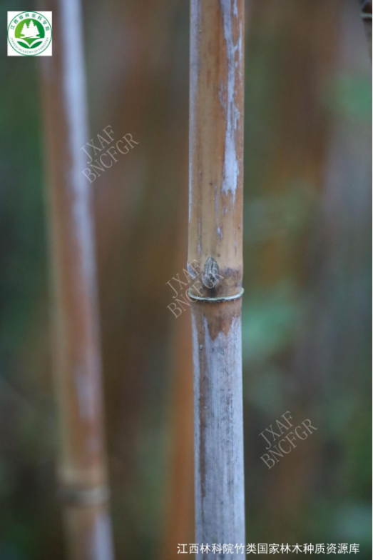 秆高2-4m,直径5-10cm;节间长24-33cm,分枝一侧下半部扁平,初被细柔毛,具细纵肋;秆环不明显;秆每节分3枝,二级分枝每节1分枝。箨鞘迟落,厚纸质或薄革质,长为节间的1/2,棕黄色带紫色,无毛或有稀疏浅棕色刚毛,较光滑;先端近截形或稍作圆拱形,边缘密生金黄色纤毛。笋期3月。产广东、香港、海南,江西、福建。生于低丘山坡或水沟边。
