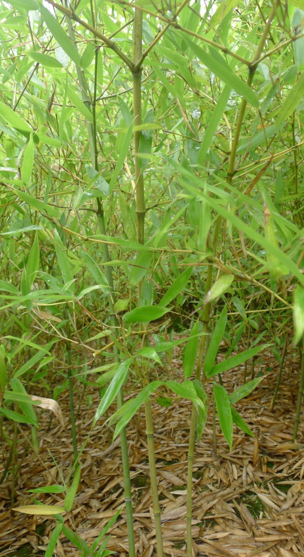 竿高达8m,粗3.5cm,幼竿被白粉,老竿平滑或为粗糙;最长的节间长32cm,壁厚约4mm,节处稍隆起;竿环与箨环同高或在细竿上高于箨环。箨鞘厚纸质,背面绿色或有紫色纵条纹,背部被易落性刺毛,边缘黄褐色;箨耳紫色,宽卵形,系由箨片基部向两侧延伸而呈,有较短的䍁毛数条;箨舌短,高约1.5mm,拱形,紫色,生短纤毛;箨片直立,三角形至窄三角形,绿紫色。末级小枝具1~3叶;鞘口䍁毛发达;叶片较厚,深绿色,下表面灰白色,长6~11.5cm,宽1~2cm。笋期5月上旬。